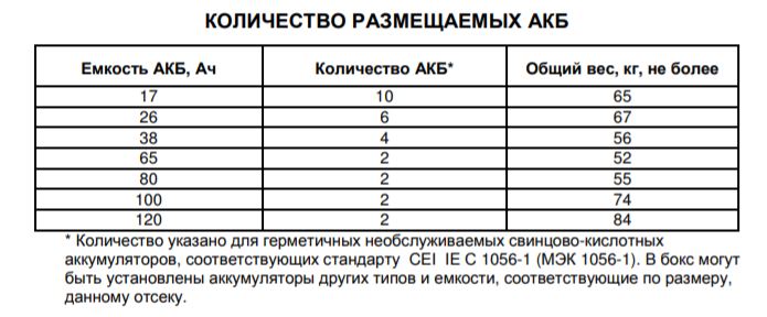 В бокс могут быть установлены аккумуляторы различных типов и емкости, соответствующие по размеру данному боксу. АО-2-120 может использоваться в напольном или настольном вариантах. Вместимость бокса представлена в таблице: