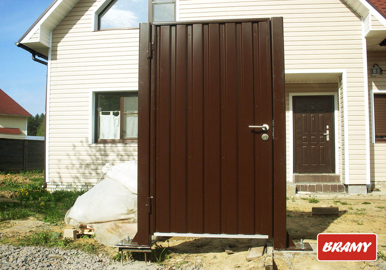 Каркас всей конструкции выполнен из металлической трубы квадратного сечения. Они сварены между собой, исходя из формы калитки: в виде прямоугольника или квадрата. На основу также крепятся петли и засов с врезным замком. Части каркаса называются лагами. На лаги крепится профильный лист оцинкованного металла. Оцинковка означает, что дверь может прослужить много лет верой и правдой, - ей не страшны дождь, влажность и морозы. Чтобы конструкция была надежно закреплена, используют столбы квадратного сечения 60 на 60 мм.