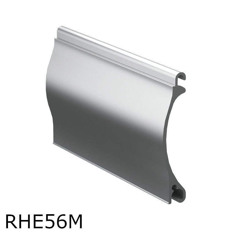 Ширина данного профиля составляет 58 мм, что выделяет его на фоне остальных, более компактных моделей. Тем не менее, благодаря выпукло-вогнутой форме, такие секции плотно наматываются на вал, и умещаются в небольшом коробе над проемом. Материал для RHE58M выбран стандартный - неперфорированный алюминий.