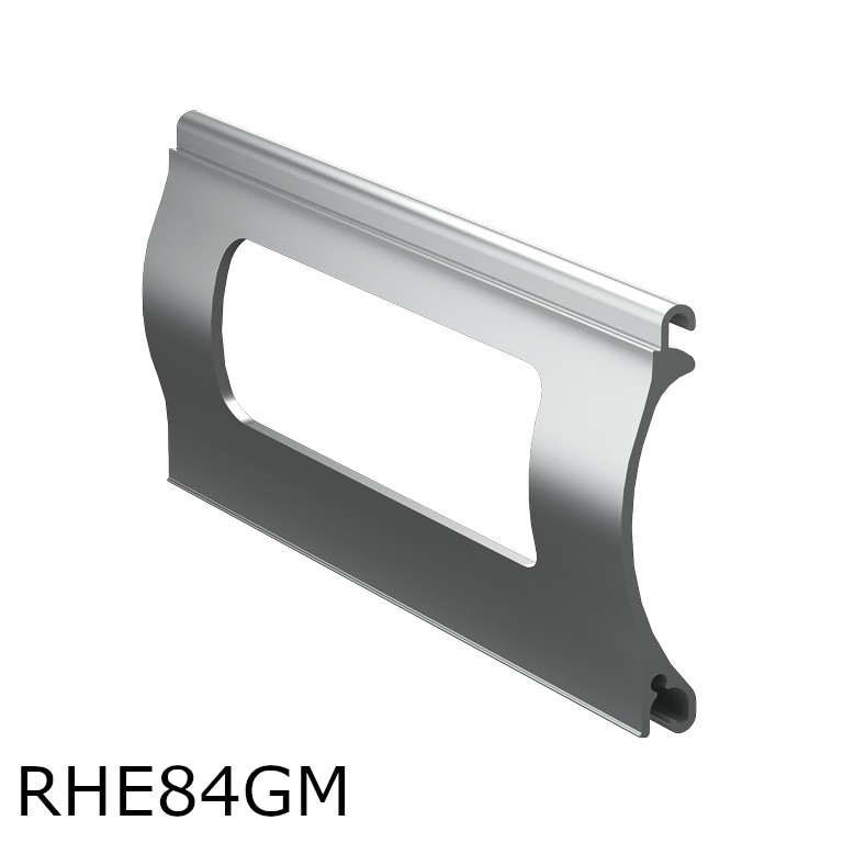 С помощью RHE84M можно создавать роллетные системы площадью до 20 квадратных метров. Предел ширины полотна у данной модели - 6 метров. На 1 метр высоты приходится примерно 12 ламелей из экструдированного алюминия. Как понятно из самого названия, ширина каждого ламеля составляет 84 мм. Поверхность секций RHE84M неперфорированная, сплошная. Благодаря выпукло-вогнутой форме, они плотно наматываются на вал и не занимают много места в сложенном виде.