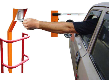 Карта , с помощью СКУД, передает сигнал шлагбауму и тот открывается.