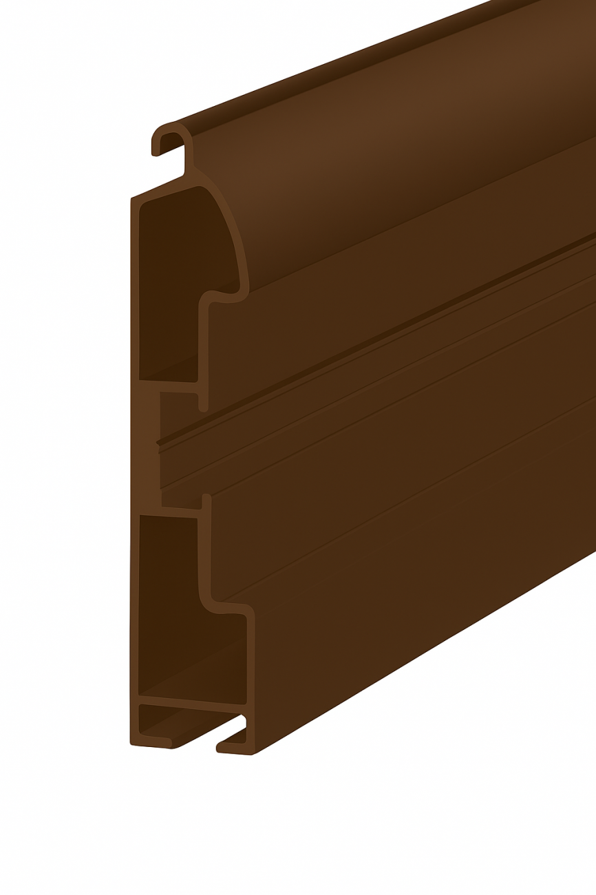 Ригельный (концевой) профиль ALUTECH ESR60R — экструдированный алюминиевый элемент для роллетных решёток серии AEG56. Предназначен для жёсткого и аккуратного завершения полотна и установки ригельного замка RL при варианте монтажа коробом наружу. Цвет исполнения: 102 коричневый