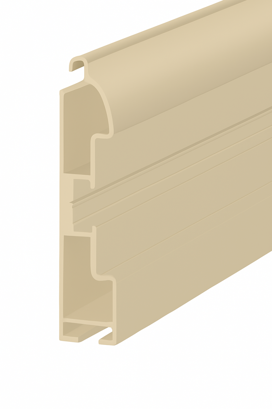 ALUTECH ESR60R — ригельный профиль из экструдированного алюминия, который служит жёстким и аккуратным завершением полотна роллетной решётки. Его задача — сформировать прочную кромку, подготовить посадочные места под фирменную оснастку и обеспечить стабильную работу полотна при ежедневных циклах подъёма/опускания. За счёт продуманной геометрии ригель равномерно распределяет нагрузку, уменьшает паразитные люфты и помогает сохранять ровную линию примыкания без «ступенек» и перекосов.