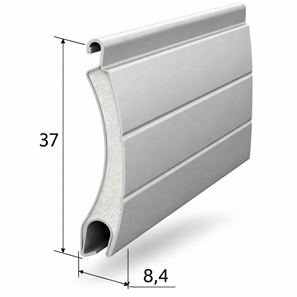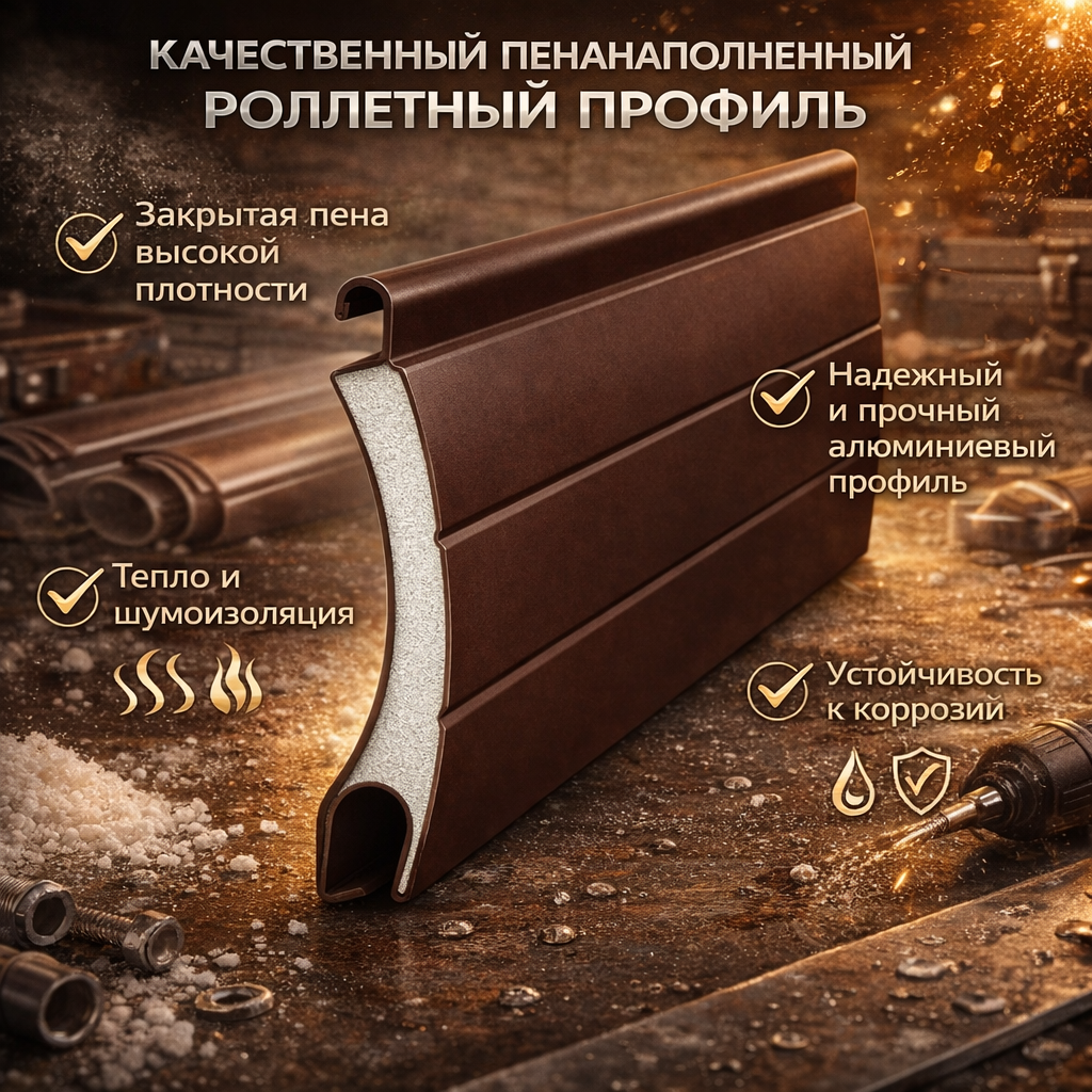 По данным производителя, профиль выполнен с пенным заполнением. В реальном сценарии это дает более собранное ощущение полотна при движении и помогает снизить лишние призвуки при открывании и закрывании, что особенно ценно там, где рольставни работают часто - в частных домах, офисах, на объектах с регулярным режимом доступа.