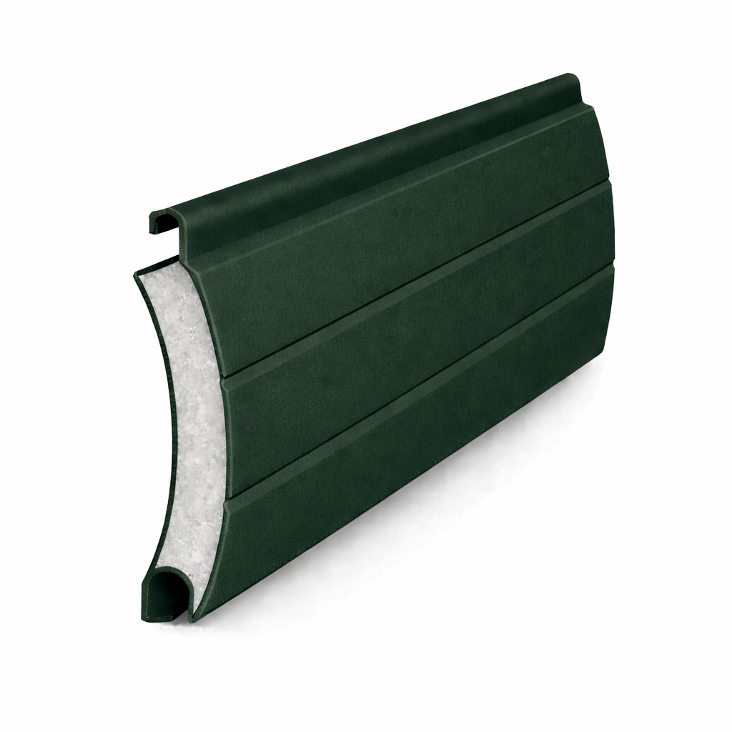 ALUTECH AR/41N - пенонаполненный алюминиевый профиль роликовой прокатки для сборки полотна рольставней. Исполнение N - неперфорированная ламель, когда нужен полностью закрытый проем без световых просветов. Данная позиция на сайте - цвет 115 зеленая ель.