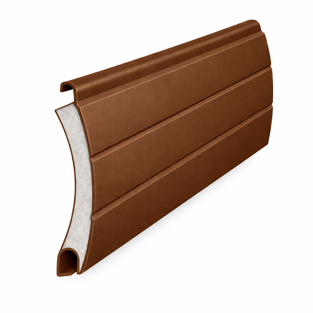 ALUTECH PD/39N - профиль роллетный роликовой прокатки с пенным заполнением для изготовления полотна рольставней. Исполнение N - неперфорированное, когда нужен полностью закрытый проем без световых просветов. Вариант cv.102 - коричневый цвет.