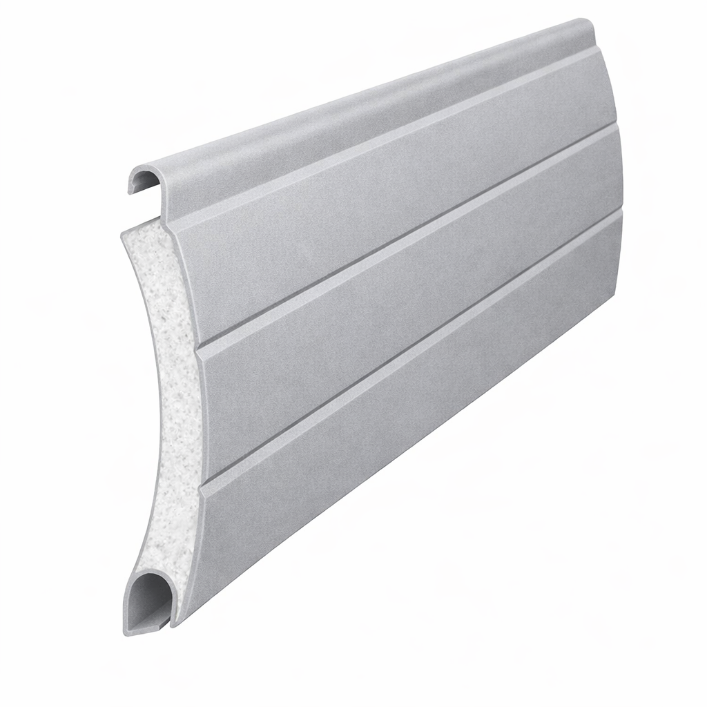 ALUTECH PD/39N - профиль роллетный роликовой прокатки с пенным заполнением для изготовления полотна рольставней. Исполнение N - неперфорированное, когда нужен полностью закрытый проем без световых просветов. Вариант cv.103 - серый цвет.