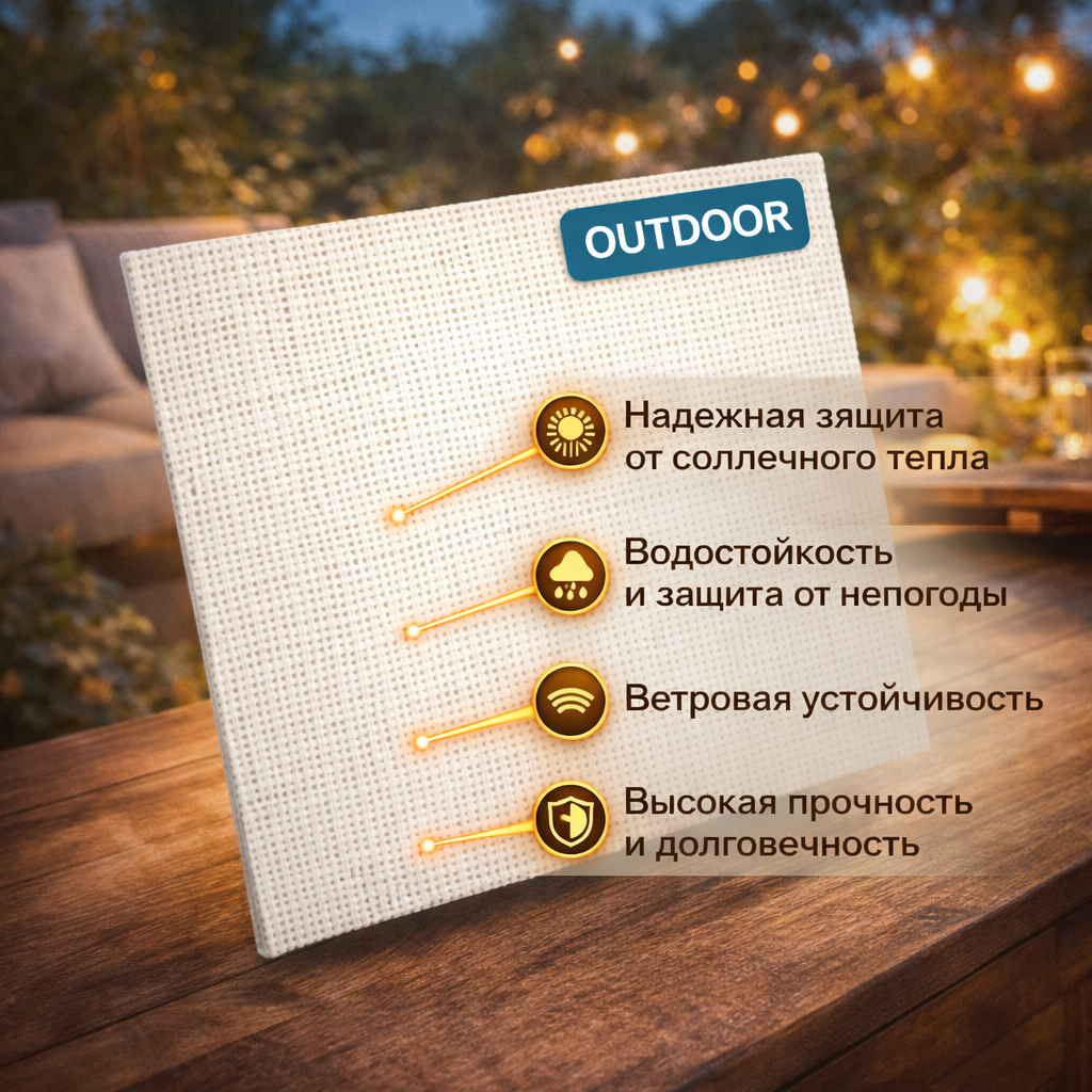 - подходит для уличных солнцезащитных решений и влажных помещений