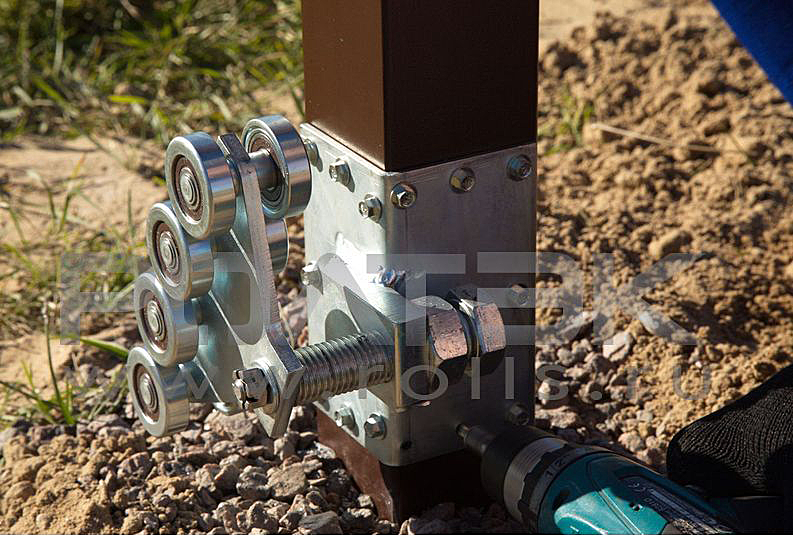 Регулировка положения створки проста и удобна, и производится путем вращения эксцентрикового болта на опорах, после чего необходимо затянуть настроенный болт гайкой. Диапазон совместной регулировки двух опор достигает 55 мм для проёма 4 м. Опоры в конструкции откатных самонесущих ворот воспринимают нагрузки от створки ворот и передают их на столб. Совместно с направляющей обеспечивают перемещение створки. В опоре 8 роликов и цельная плита. Конструкция опор обеспечивает их саморегулируемость и постоянный одновременный контакт с направляющей не менее 6 роликов.