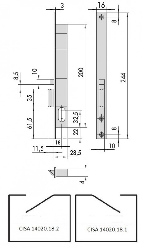 Замок нереверсивный: существует два варианта замка для правых и левых дверей. Cisa 14020.18.2 - открытие вправо. Видимая лицевая планка и взводная защелка оцинкованные, полированные. Запорная защелка латунная.Рекомендуемые параметры сигнала управления: импульсное или переменное напряжение 12В, мощность 15ВА. Особенностью замка являются его габаритные размеры, позволяющие использовать его малоразмерных профилях. Отсутствие дополнительных способов отпирания с помощью ручки или механической кнопки.